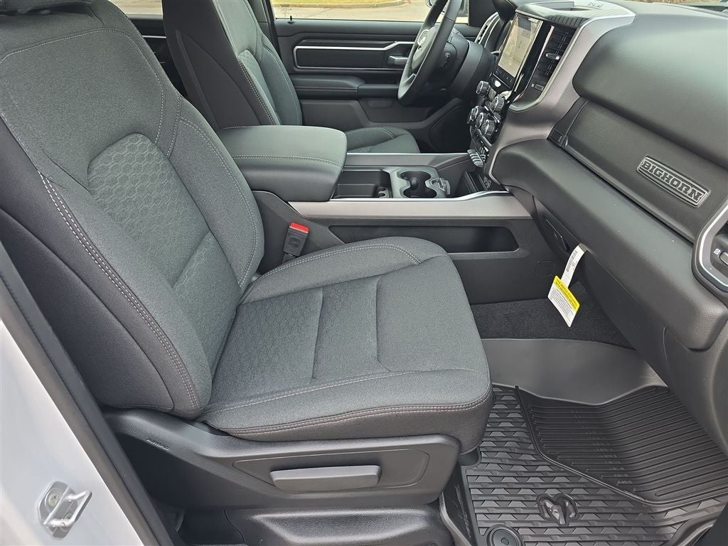Bright White Clearcoat 2026 Ram 1500 Big Horn/Lone Star 4WD 8-Speed Automatic HEMI 5.7L V8 Multi Displacement VVT eTorque 115V Auxiliary Power Outlet, 2nd Row in Floor Storage Bins, 3 Rear Seat Head Restraints, 4 Way Front Headrests, 4-Wheel Disc Brakes, 400W Inverter, 48V Belt Starter Generator, 4G LTE Wi-Fi Hot Spot, 6 Speakers, ABS brakes, Air Conditioning, Alloy wheels, AM/FM radio, Apple CarPlay, Apple CarPlay/Android Auto, Auto High-beam Headlights, Auto Power-Folding Mirrors, Auto-Dimming Exterior Driver Mirror, Auto-Dimming Rear-View Mirror, Big Horn Level 1 Equipment Group, Black Exterior Mirrors, Black Interior Accents, Black Premium Power Mirrors, Body Color Door Handles, Body Color Fender Flares, Body Color Front Bumper, Body Color Rear Bumper with Step Pads, Body Color Tailgate Handle, Brake assist, Bucket Seats, Bumpers: chrome, Center Console Parts Module, Cloth Bucket Seats, Compass, Connectivity - US/Canada, Convex Wide-Angle Exterior Mirror Insert, Delay-off headlights, Deluxe Cloth Bucket Seats, Driver door bin, Dual front impact airbags, Dual front side impact airbags, Electronic Stability Control, Exterior Mirrors Courtesy Lamps, Exterior Mirrors with Heating Element, Exterior Mirrors with Supplemental Signals, Front anti-roll bar, Front Bucket Seats, Front Center Armrest w/Storage, Front fog lights, Front License Plate Bracket, Front reading lights, Front Seat Back Map Pockets, Front wheel independent suspension, Full Length Floor Console, Fully automatic headlights, Global Telematics Box Module, Glove Box Lamp, Google Android Auto, GPS Antenna Input, Grille Surround 1 Body Color Texture 1 Black, Heated door mirrors, Heated Front Seats, Heated Steering Wheel, Illuminated entry, Integrated Center Stack Radio, Integrated Voice Command with Bluetooth®, Leather Wrapped Steering Wheel, Low tire pressure warning, Manual Adjust 4-Way Driver Seat, Manual Adjust 4-Way Front Passenger Seat, Manual Folding Exterior Mirrors, Manufacturer's Statement of Origin, MOPAR Front and Rear Rubber Floor Mats, Occupant sensing airbag, Outside temperature display, Overhead airbag, Overhead console, Panic alarm, ParkView Rear Back-Up Camera, Passenger door bin, Passenger vanity mirror, Power 2-Way Driver Lumbar Adjust, Power Adjust 8-Way Driver Seat, Power Adjustable Pedals, Power door mirrors, Power steering, Power windows, Quick Order Package 27Z Big Horn, Radio data system, Radio: Uconnect 5 W with 8.4 Display, RAM Grille Badge - Chrome, Rear 60/40 Folding Seat, Rear anti-roll bar, Rear Center Armrest, Rear Dome with on/Off Switch Lamp, Rear Power Sliding Window, Rear step bumper, Rear Window Defroster, Remote keyless entry, SiriusXM Radio Service, SiriusXM Satellite Radio, Speed control, Sport Appearance Package, Steering Wheel Mounted Audio Controls, Sun Visors with Illuminated Vanity Mirrors, Supplier Part Tracking (J-1), Tachometer, Telescoping steering wheel, Tilt steering wheel, Traction control, Trip computer, Universal Garage Door Opener, USB Host Flip, Variably intermittent wipers, Voltmeter, Wheels: 18 x 8 Cast-Aluminum Painted.