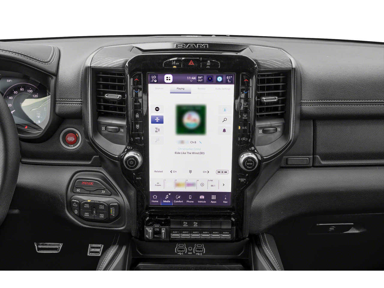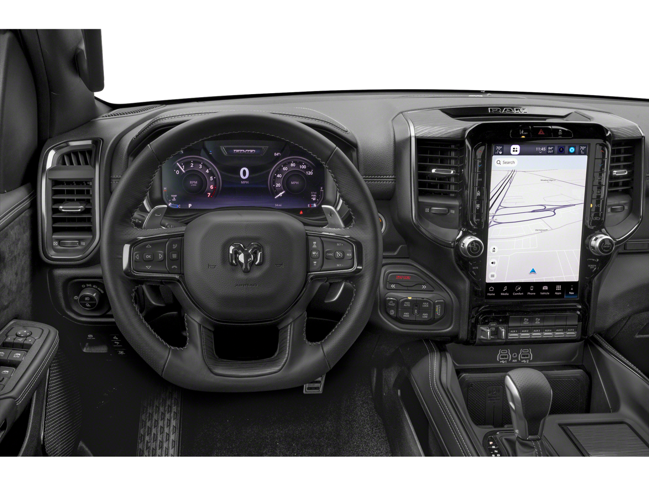 Forged Blue Metallic 2026 Ram 1500 RHO 4WD 8-Speed Automatic 3.0L I6 10 Speakers, 12-Way/1-Way Trailer Connector, 14.4 Touchscreen Display, 240 Amp Alternator, 3.92 Rear Axle Ratio, 4-Wheel Disc Brakes, 4G LTE Wi-Fi Hot Spot, ABS brakes, Adaptive suspension, Adjustable pedals, Air Conditioning, Alloy wheels, AM/FM radio, Apple CarPlay/Android Auto, Auto High-beam Headlights, Auto Power-Folding Mirrors, Auto-dimming door mirrors, Auto-Dimming Exterior Driver Mirror, Auto-dimming Rear-View mirror, Automatic temperature control, Brake assist, Compass, Connected Travel and Traffic Services, Connectivity - US/Canada, Delay-off headlights, Disassociated Touchscreen Display, Dome Dual LED Reading Lamp, Driver door bin, Driver Power Seat Back Massage, Driver Seat Memory, Driver vanity mirror, Driver/Passenger Wrapped Assist Handles, Drowsy Driver Detection, Dual front impact airbags, Dual front side impact airbags, Dual Wireless Charging Pad, Dual-Pane Panoramic Sunroof, Electronic Stability Control, Evasive Steer Assist, Exterior Mirrors Courtesy Lamps, Exterior Mirrors with Heating Element, Exterior Mirrors with Memory, Exterior Mirrors with Supplemental Signals, Exterior Parking Camera Rear, Flareside Box, Front anti-roll bar, Front Bucket Seats, Front Center Armrest w/Storage, Front dual zone A/C, Front fog lights, Front License Plate Bracket, Front Passenger Interactive Display, Front Passenger Power Seat Back Massage, Front reading lights, Front wheel independent suspension, Full Length Premium Upgraded Floor Console, Fully automatic headlights, Garage door transmitter, GPS Navigation, Hands-Free Active Driving Assist System, Harman/Kardon 19 Speaker Premium Sound, HD Radio, Heads-Up Display, Heated door mirrors, Heated front seats, Heated Second Row Seats, Heated steering wheel, Illuminated entry, Integrated Center Stack Radio, Integrated Voice Command with Bluetooth®, Intersection Collision Assist System, Leather Shift Knob, Leather steering wheel, Leather Trimmed Bucket Seats, Leather/Carbon Flat-Bottom Steering Wheel, LED CHMSL Lamp, Low tire pressure warning, Luxury Front Door Trim Panel, Manufacturer's Statement of Origin, MOPAR Off-Road Style Running Boards, Navigation System, Occupant sensing airbag, Outside temperature display, Overhead airbag, Overhead console, Panic alarm, Passenger door bin, Passenger vanity mirror, Power Adjustable Pedals with Memory, Power door mirrors, Power driver seat, Power passenger seat, Power steering, Power Tailgate, Power windows, Premium Wrapped Instrument Panel Bezel, Quick Order Package 22Y RHO, Radio data system, Radio: Uconnect 5 Nav with 14.4 Display, Radio: Uconnect 5 Navigation with 12.0 Display, Radio/Driver Seat/Mirrors/Pedals Memory, Rain Sensitive Windshield Wipers, Real Carbon Fiber Interior Accents, Rear 60/40 Folding Split Recline Seat, Rear reading lights, Rear seat center armrest, Rear step bumper, Rear window defroster, Remote keyless entry, RHO Level 1 Equipment Group, Security system, SiriusXM Radio Service, Smartphone as a Key Capable, Speed control, Split folding rear seat, Sport steering wheel, Steering wheel mounted audio controls, Surround View Camera System, Tachometer, Telescoping steering wheel, Tilt steering wheel, Traction control, Traffic Sign Recognition, Trip computer, Turn signal indicator mirrors, USB Host Flip, Variably intermittent wipers, Ventilated Front Seats, Ventilated Rear Seats, Voltmeter, Wheels: 18 x 9 Black Paint/Polish Aluminum.