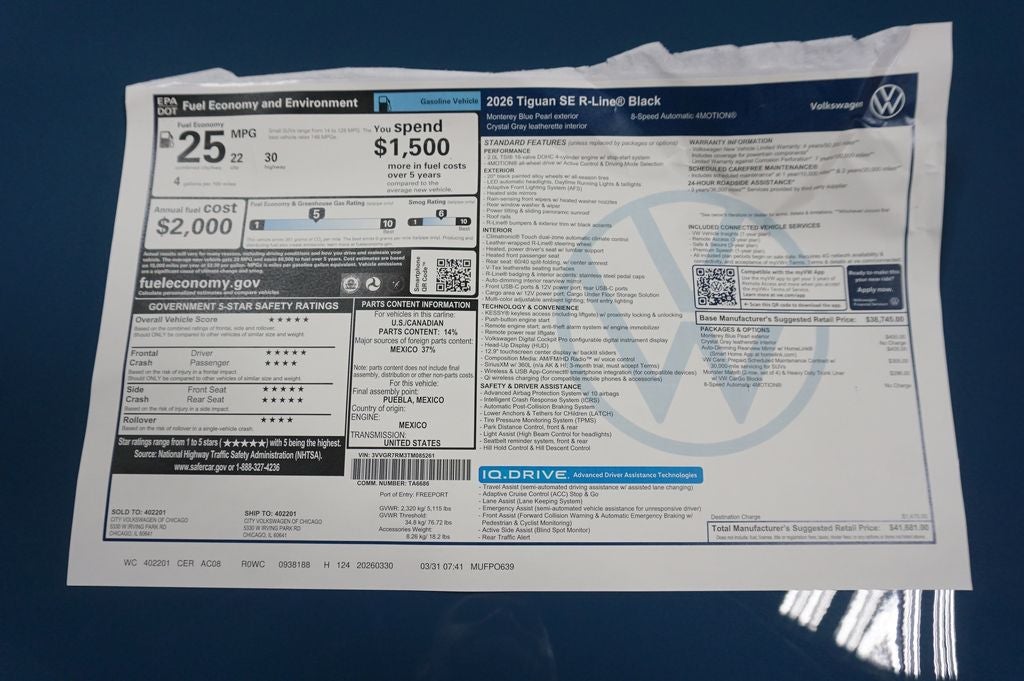 2026 Volkswagen Tiguan 2.0T SE R-Line Black 2.0L TSI DOHC Blue AWD Price includes: $1000 - Customer Bonus. Exp. 04/30/2026