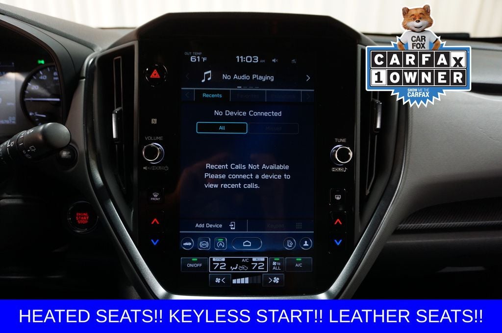 - Radio: Subaru STARLINK 11.6" Multimedia Plus Sys -inc: AM/FM stereo, HD Radio, multi-touch gesture high resolution display screen, voice activated controls, Bluetooth® audio streaming and hands-free phone connectivity, Bluetooth® hands-free SMS text messaging connectivity, iPod control capability, SiriusXM All Access Radio (4 months free trial included/subscription required after), SiriusXM Travel Link (4 months free trial included/subscription required after), smartphone integration: Android Auto and Apple CarPlay w/full screen view and wireless connection, USB and Over The Air (OTA) audio system update, steering wheel audio system and Bluetooth® control switches, 6 speakers (2 dash panel tweeter, 2 front door and 2 rear door), illuminated 3.5mm auxiliary input jack, illuminated front USB A and C input/charge ports and illuminated rear USB A and C charge ports